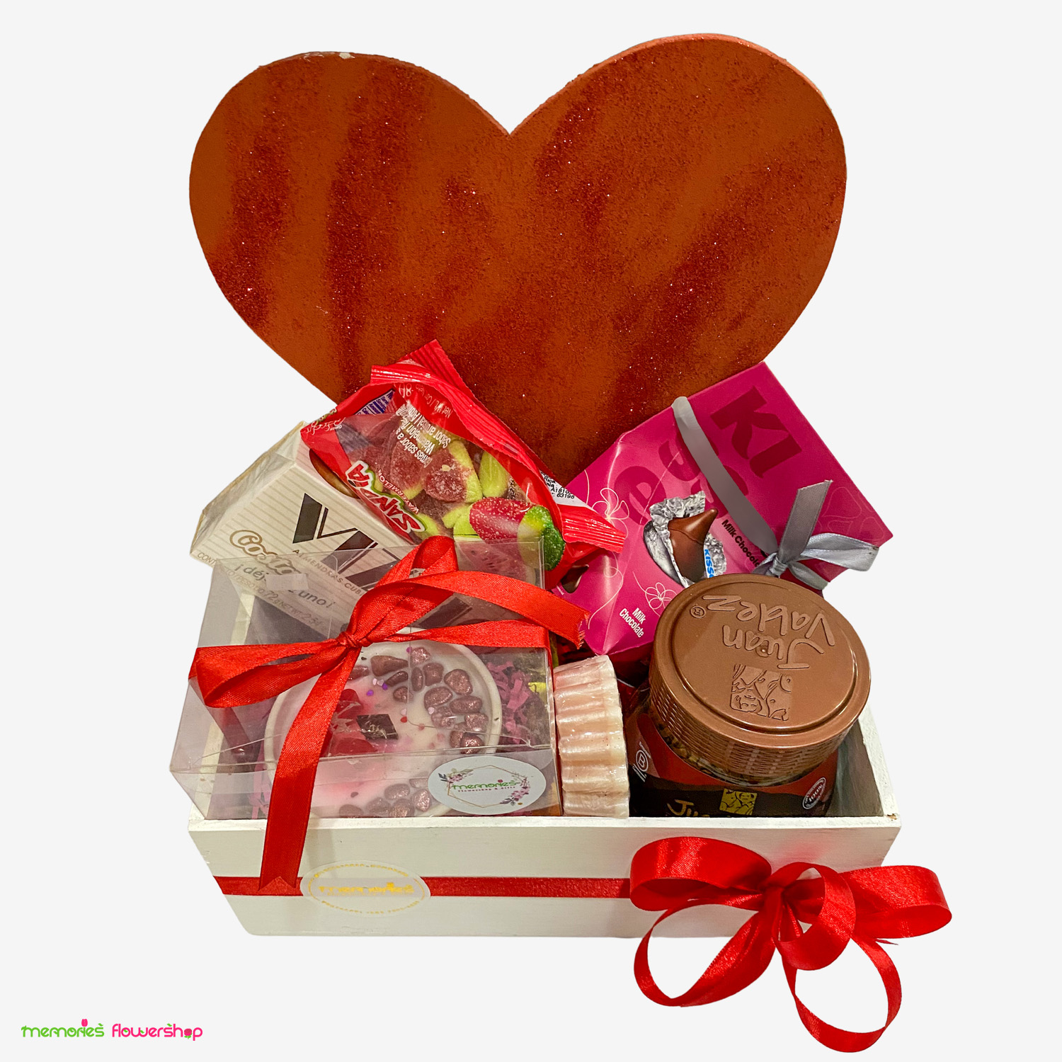 Este arreglo incluye una caja de madera con un café Juan Valdez, chocolates variados, jabones naturales y una vela aromática. La vista muestra todos los elementos organizados de manera atractiva sobre un fondo de corazón rojo con glitter. Ideal para San Valentín o otras ocasiones de amor.