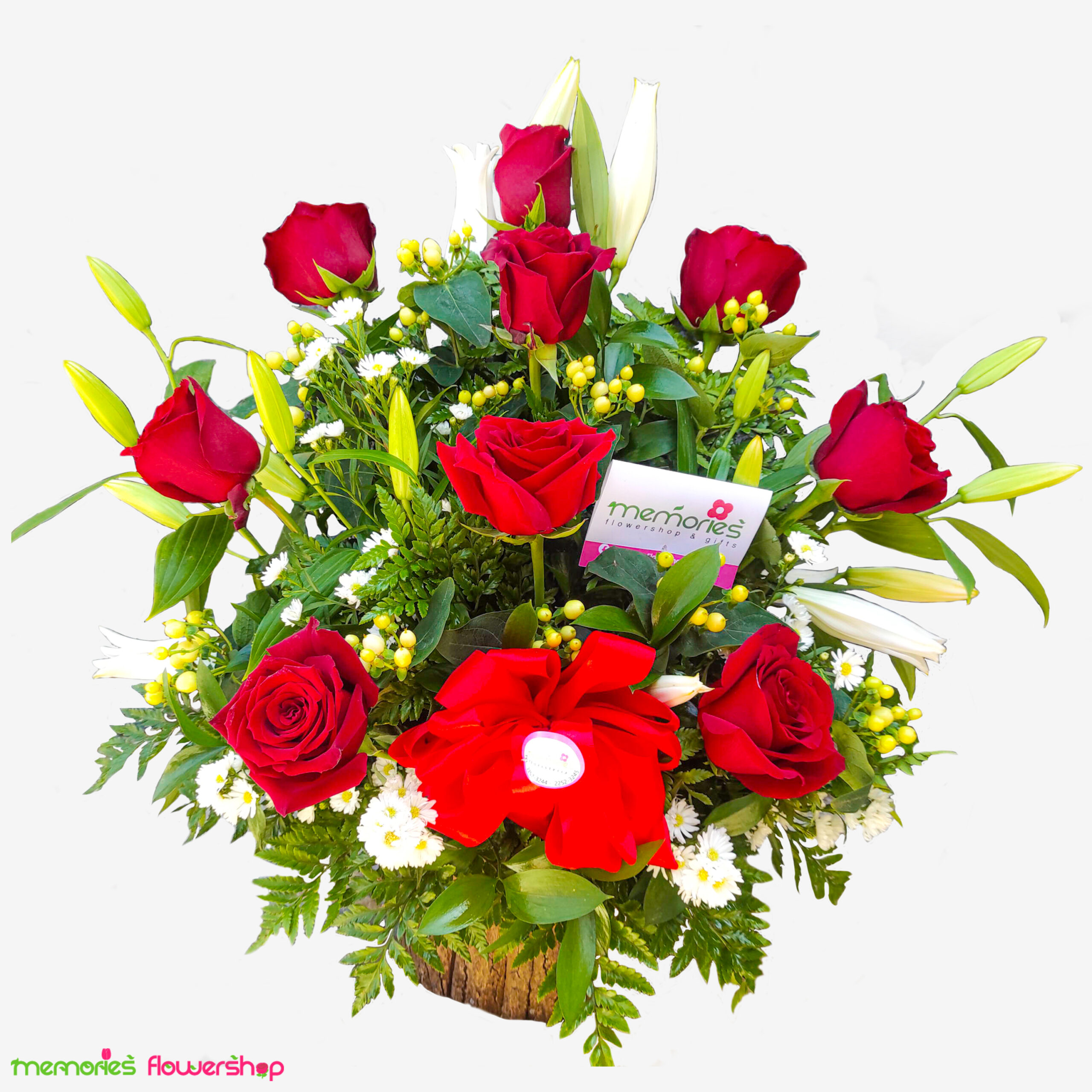 Este elegante arreglo combina rosas rojas de ecuador y lirios blancos con hipericum y follajes, presentado en una hermosa base de madera, ideal para expresar el amor.