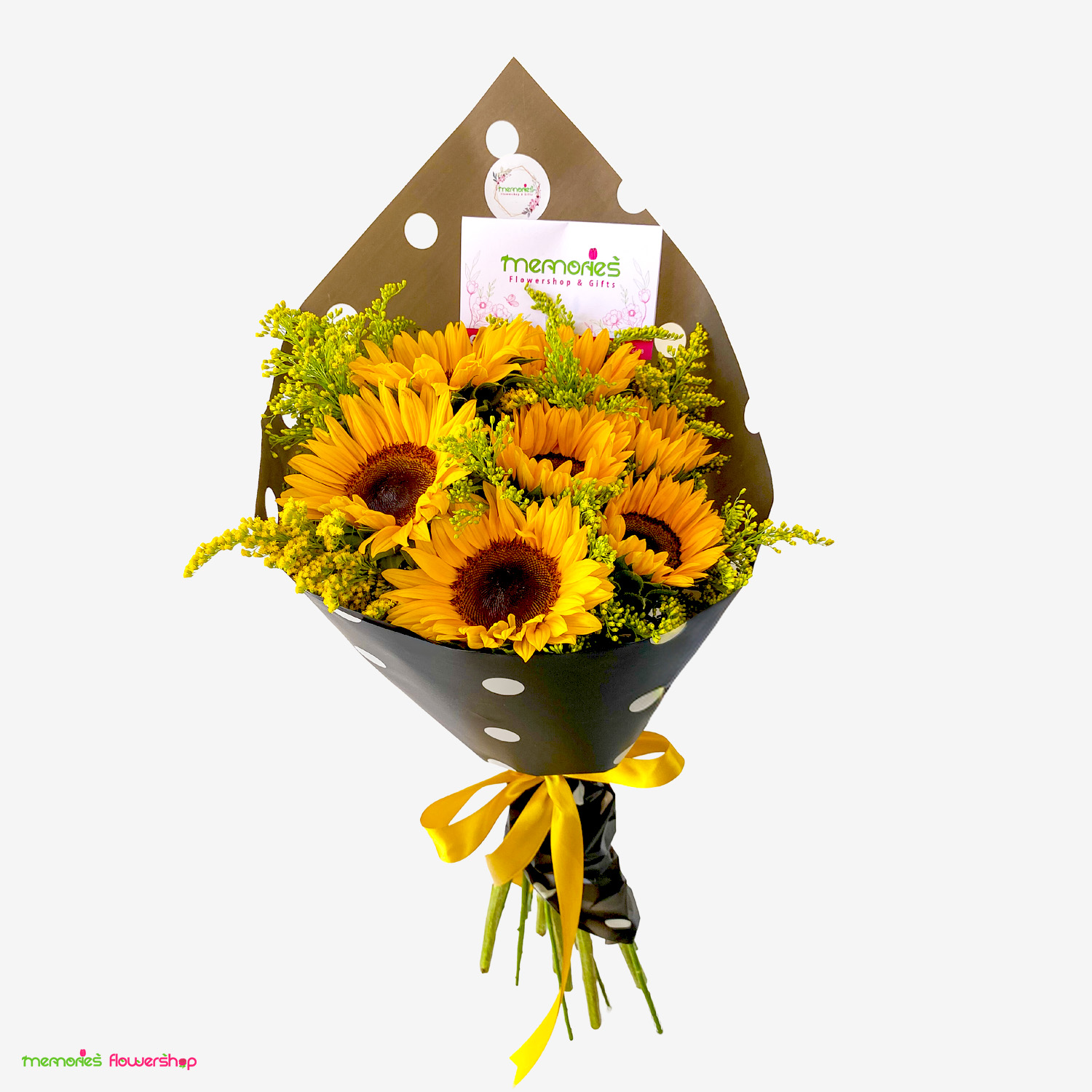 Un cono único con vibrantes girasoles, solidago y follaje, cuidadosamente envuelto en papel coreano. Un detalle ideal para regalar el 21 de marzo, Día de las Flores Amarillas, en el 21 de septiembre, Día de las Flores Amarillas, con un toque de elegancia y frescura.