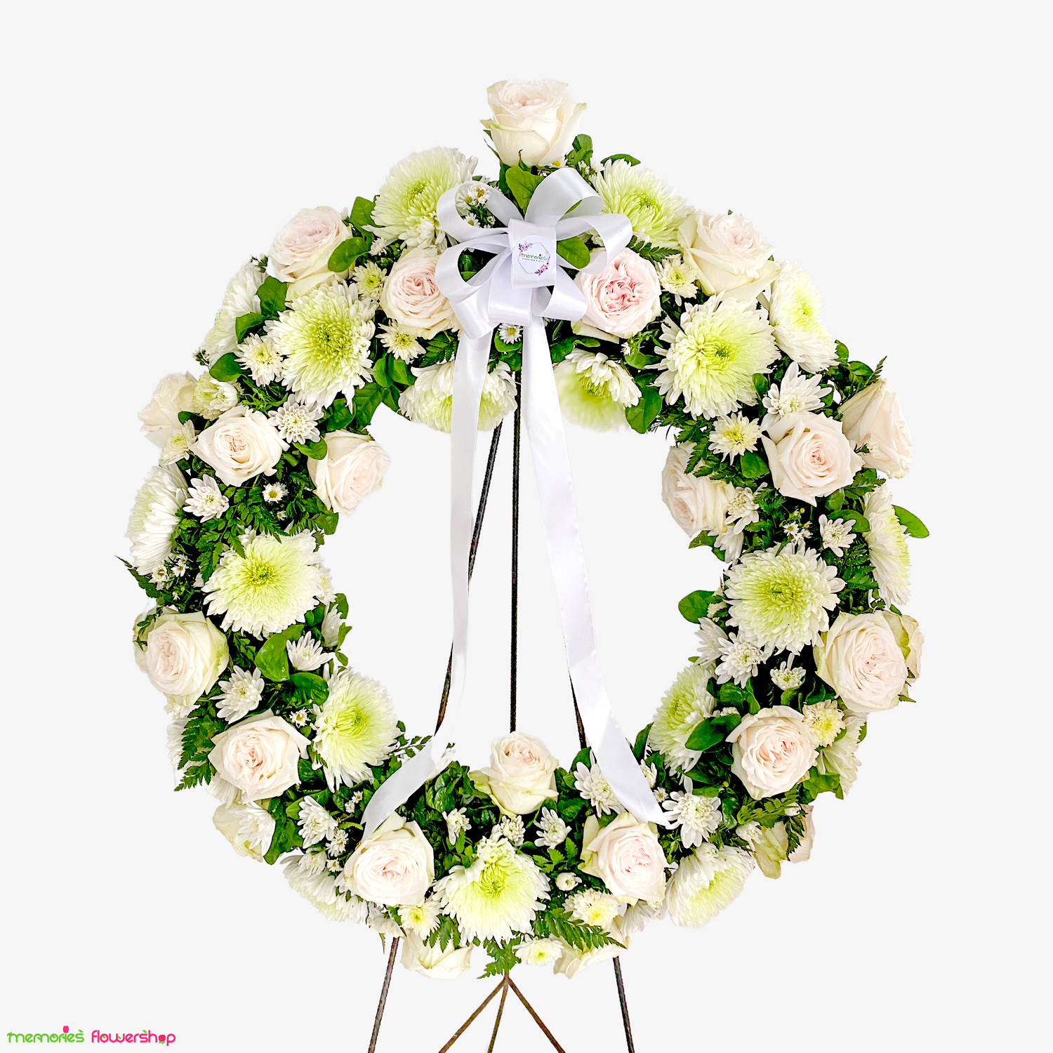 Esta elegante corona funeraria está compuesta por rosas ecuatorianas blancas, crisantemos, gypsophila, centro verde y follajes. Es una opción solemne y respetuosa para expresar condolencias en momentos difíciles.