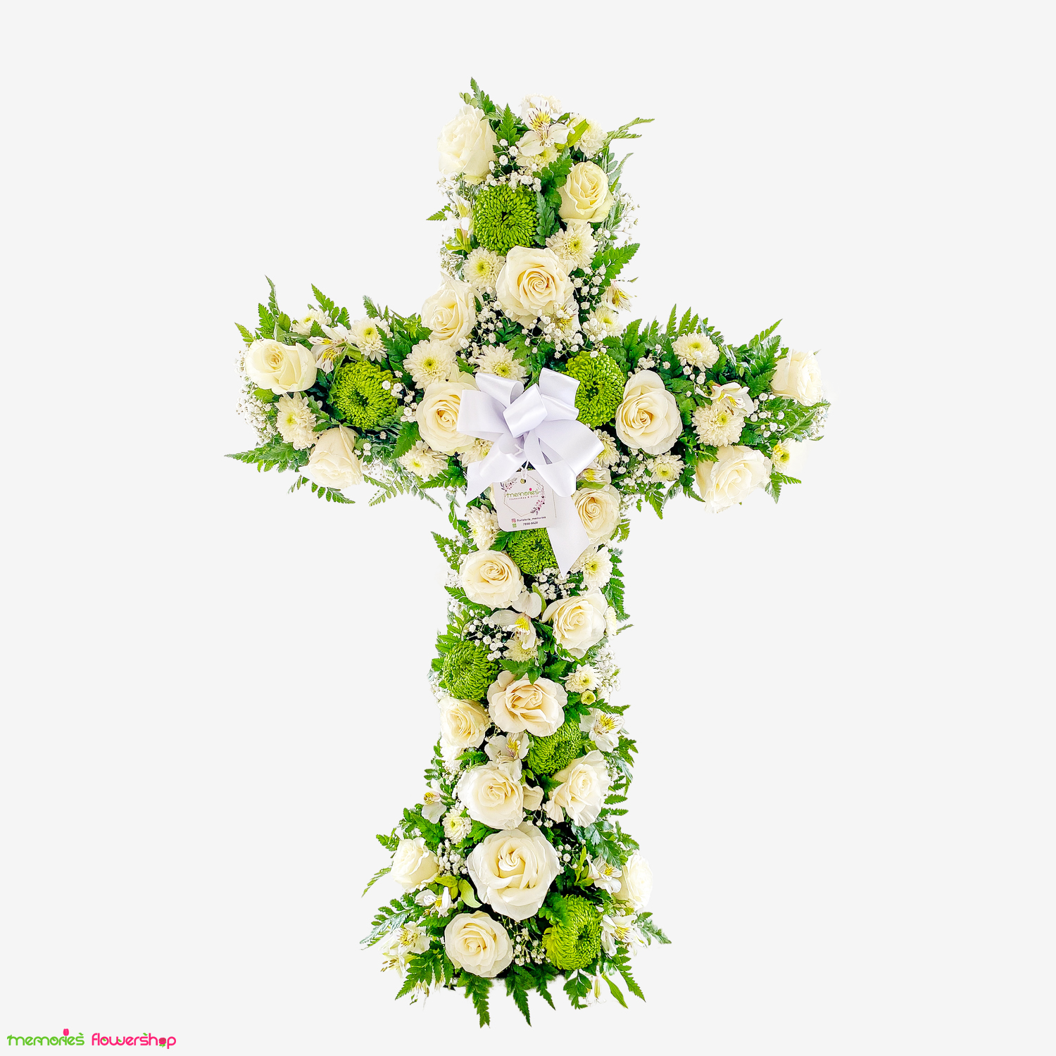 Esta cruz floral está elaborada con rosas ecuatorianas blancas, crisantemos verdes, centro verde y follajes. Es un tributo respetuoso y significativo para expresar condolencias en momentos de despedida.