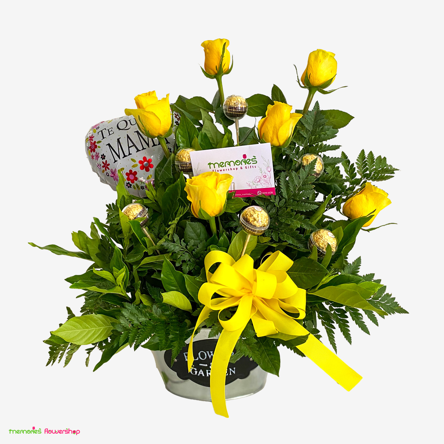 Un encantador arreglo que mezcla la calidez de las rosas amarillas con la elegancia de la gypsophila y el frescor del follaje y solidago, complementado con el sabor de los chocolates Ferrero Rocher. Perfecto para celebrar el 21 de marzo, Día de las Flores Amarillas, en el 21 de septiembre, Día de las Flores Amarillas, con un toque dulce y alegre.
