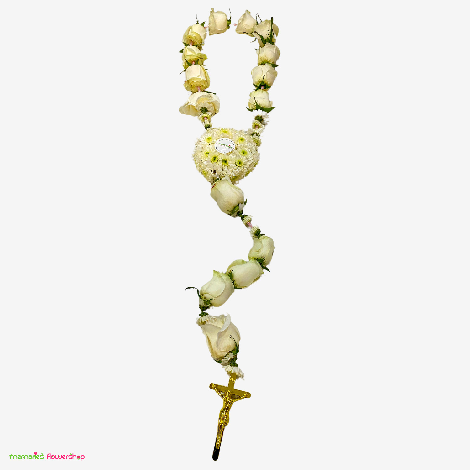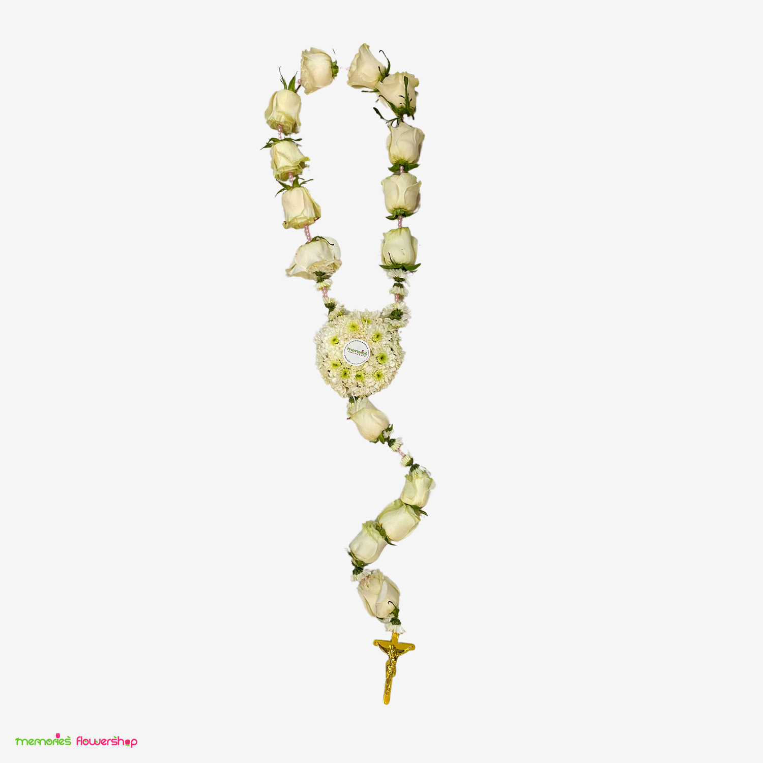 Este delicado decenario, compuesto por elegantes rosas blancas y perlas rosadas, es un símbolo de paz y devoción. Ideal para expresar condolencias y acompañar a seres queridos en momentos de reflexión espiritual y oración, ofreciendo un gesto de consuelo y fe.