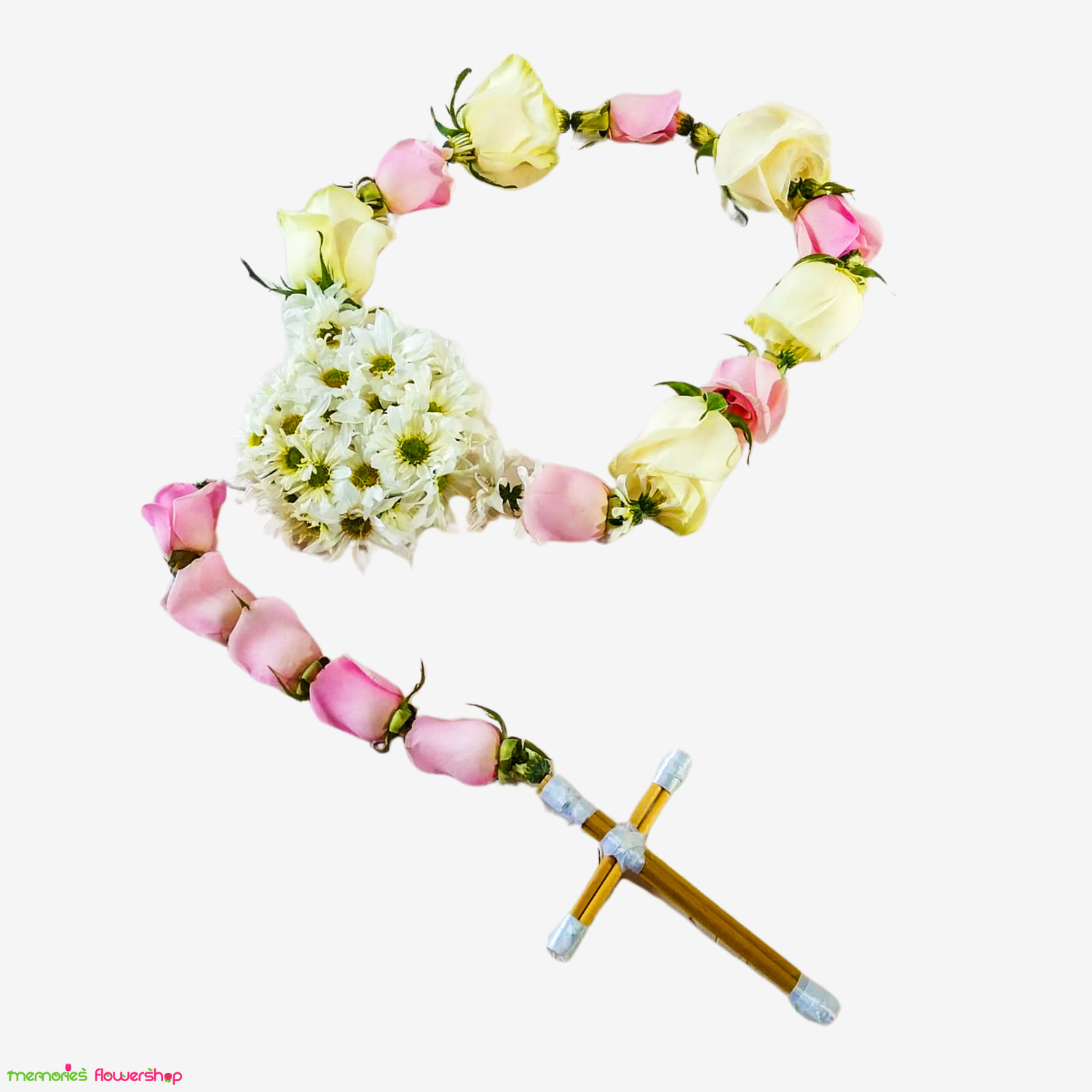 Este denario está elaborado con rosas frescas en el color de preferencia del cliente, formando un círculo de aproximadamente 10 rosas, seguido de cinco rosas del mismo color y terminado con un elegante crucifijo de madera. Un tributo significativo y devoto.