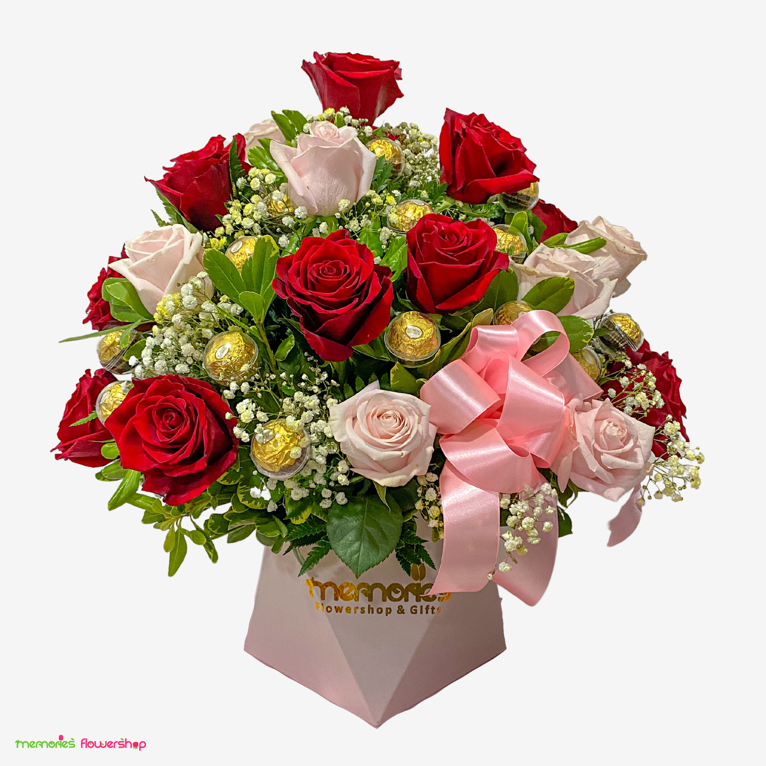 El amor florece: Un arreglo exquisito que combina 25 rosas rojas y rosas de Ecuador con 15 chocolates Ferrero, delicadamente acompañados de gypsophila y follajes. Presentado sobre una base asimétrica, este arreglo es ideal para celebrar el amor, la amistad o cualquier ocasión especial. Las rosas, frescas y vibrantes, junto con los chocolates Ferrero, crean una combinación perfecta para sorprender a tus seres queridos.