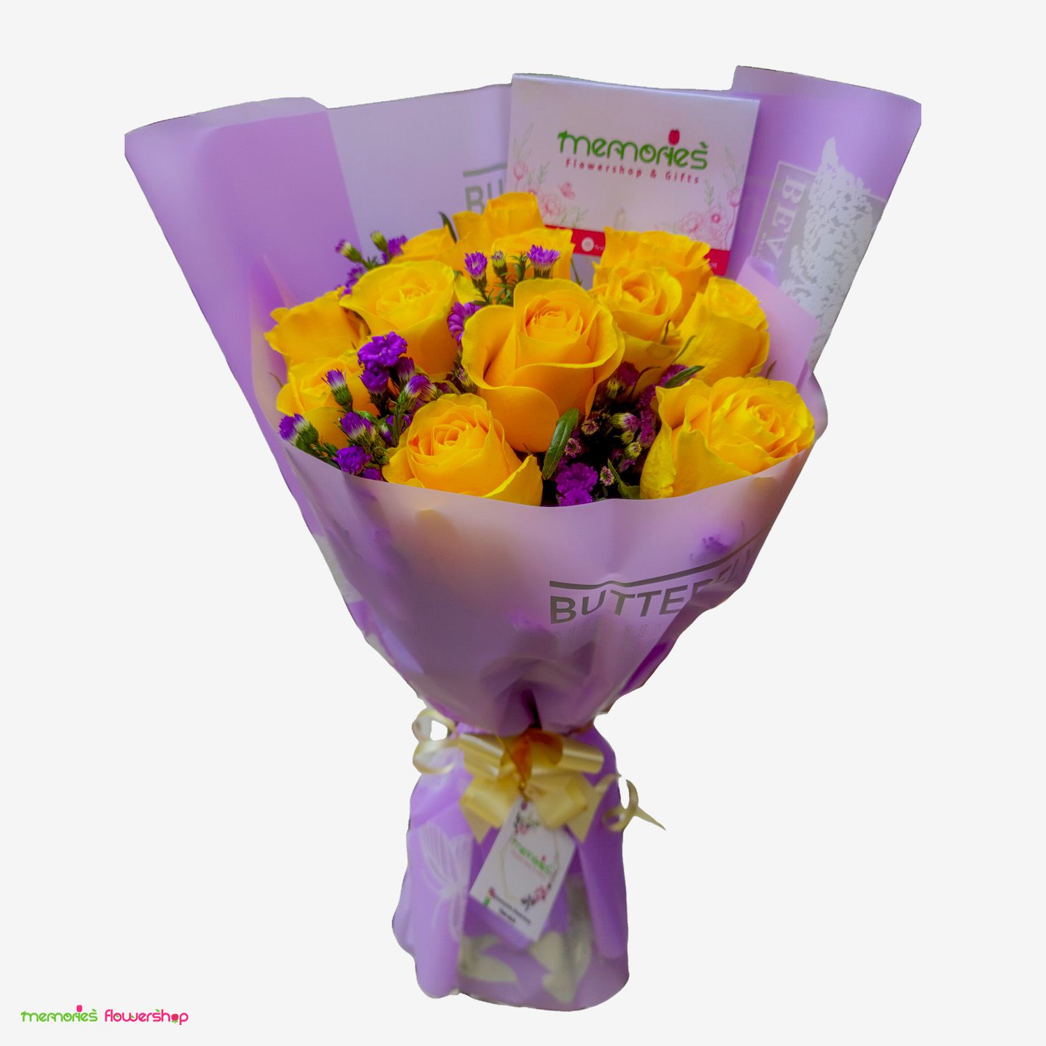 Este bouquet deslumbrante combina una docena de rosas amarillas con el sofisticado toque del montecasino morado y follaje fresco, creando una mezcla encantadora y vibrante. Perfecto para expresar alegría y elegancia en cualquier ocasión especial, especialmente en el Día de las Flores Amarillas el 21 de marzo, en el Día de las Flores Amarillas el 21 de septiembre.