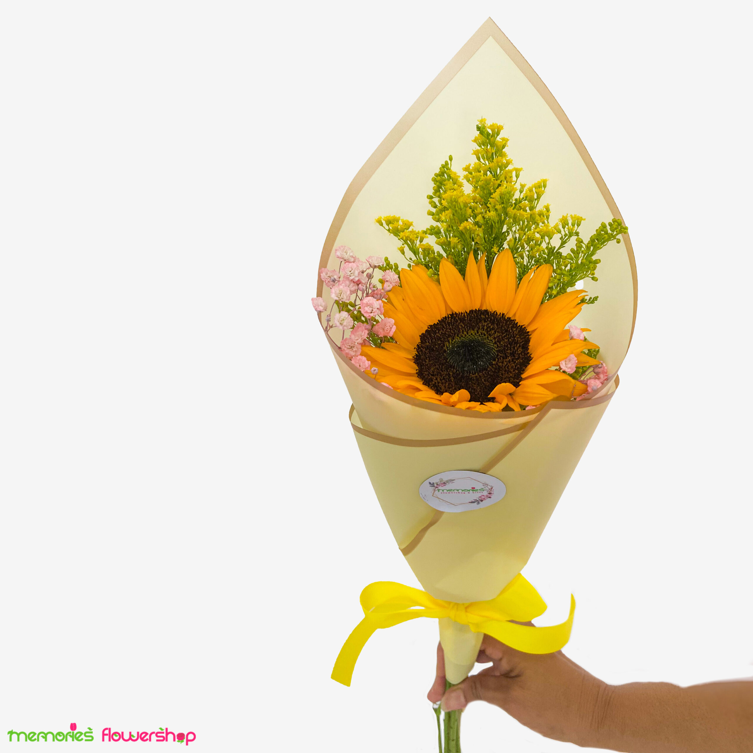 Este mini ramo, también conocido como ramillete, combina un vibrante girasol con solidago y delicada gypsophila rosada. Este ramillete es perfecto para el “Día de Flores Amarillas”.
