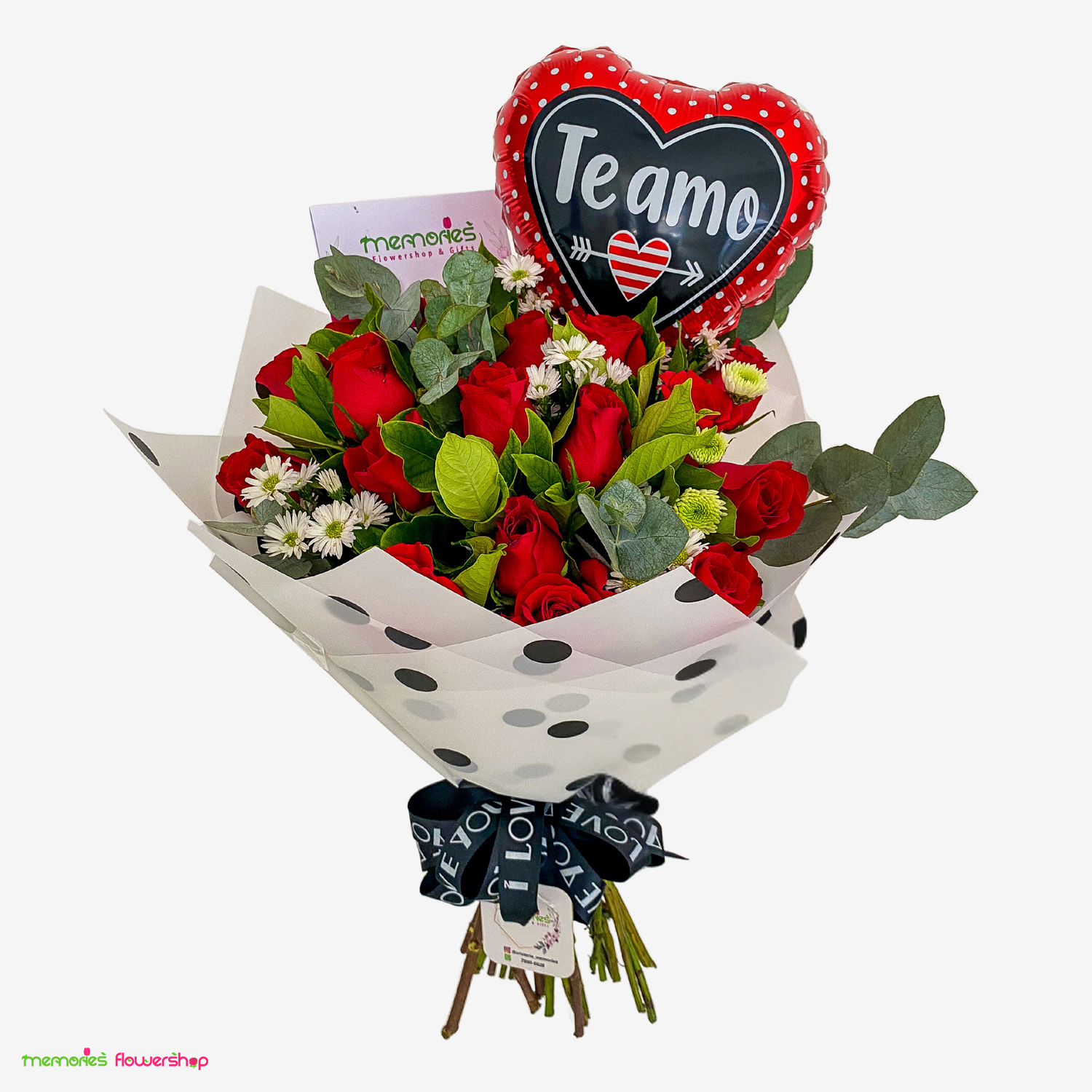 El ramo “Eterno Resplandor” es una expresión de amor y pasión, compuesto por 25 rosas rojas frescas de Ecuador, montecasino, follajes y un globo pequeño. Este arreglo floral es ideal para sorprender a esa persona especial en ocasiones como aniversarios, San Valentín o simplemente para demostrar tu amor. Cada rosa ha sido cuidadosamente seleccionada para garantizar frescura y durabilidad, creando un ramo que será el centro de atención en cualquier celebración. El globo añade un toque de alegría y modernidad a este clásico arreglo floral.