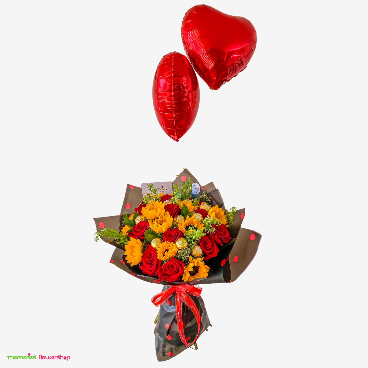 El ramo “Llegando a Ti” es una explosión de color y alegría, compuesto por rosas frescas de Ecuador, girasoles, chocolates Ferrero, follajes y dos globos con helio. Este arreglo floral es ideal para sorprender a esa persona especial en ocasiones como aniversarios, San Valentín o simplemente para demostrar tu cariño. Cada flor ha sido cuidadosamente seleccionada para garantizar frescura y durabilidad, mientras que los chocolates Ferrero y los globos añaden un toque de dulzura y modernidad. Un regalo perfecto para llegar al corazón de quien amas.