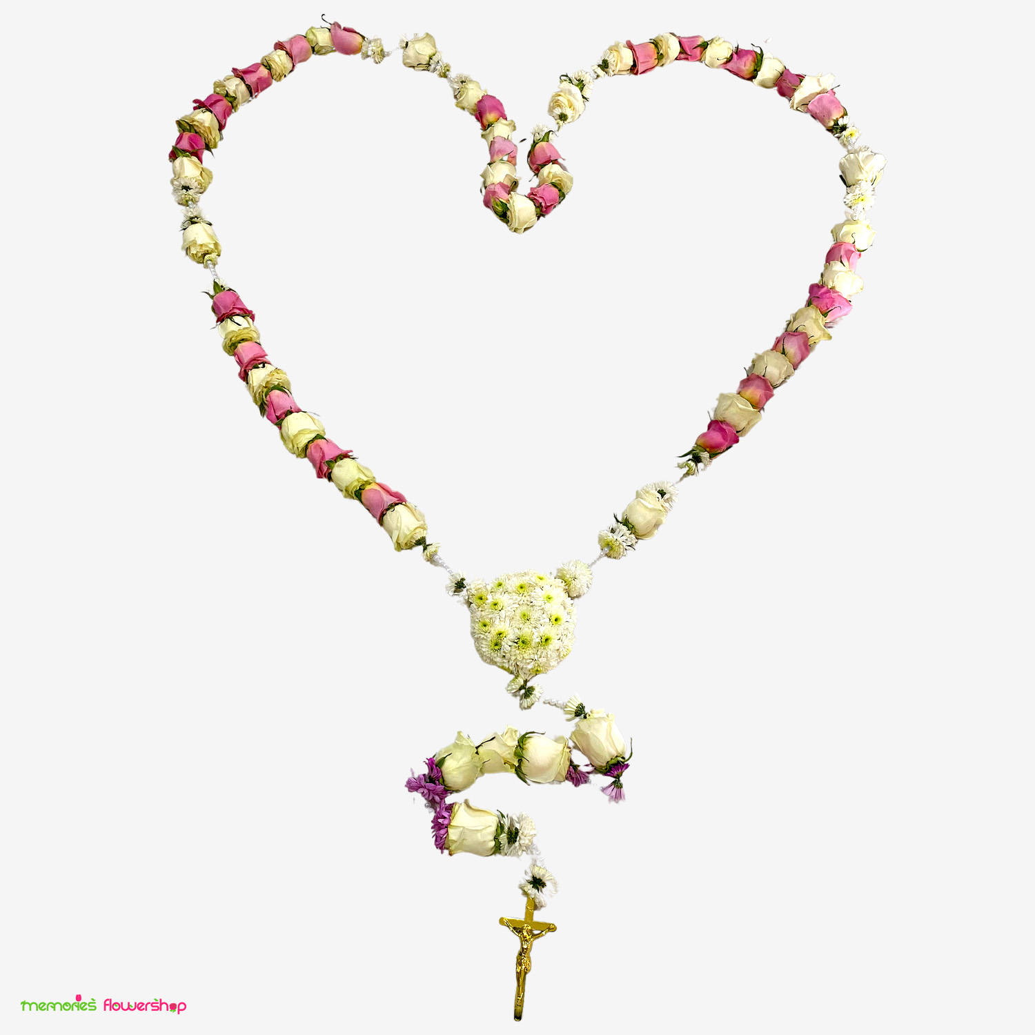 Este majestuoso rosario gigante, adornado con rosas blancas y rosadas, acompañado de delicadas perlas blancas, es una pieza simbólica de gran significado espiritual. Perfecto para expresar condolencias en ceremonias religiosas, ofreciendo un gesto de paz, devoción y respeto en momentos de duelo.